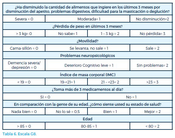 La Escala G8, fue desarrollada por el Instituto Bergonié, tiene 8 items y define a los pacientes como vulnerables si presenta ≤ 14 puntos. Esta escala predice la toxicidad a la quimioterapia, deterioro funcional y supervivencia y es una de las más utilizadas en el ámbito oncogeriátrico por su sencillez y rapidez (Tabla 6).